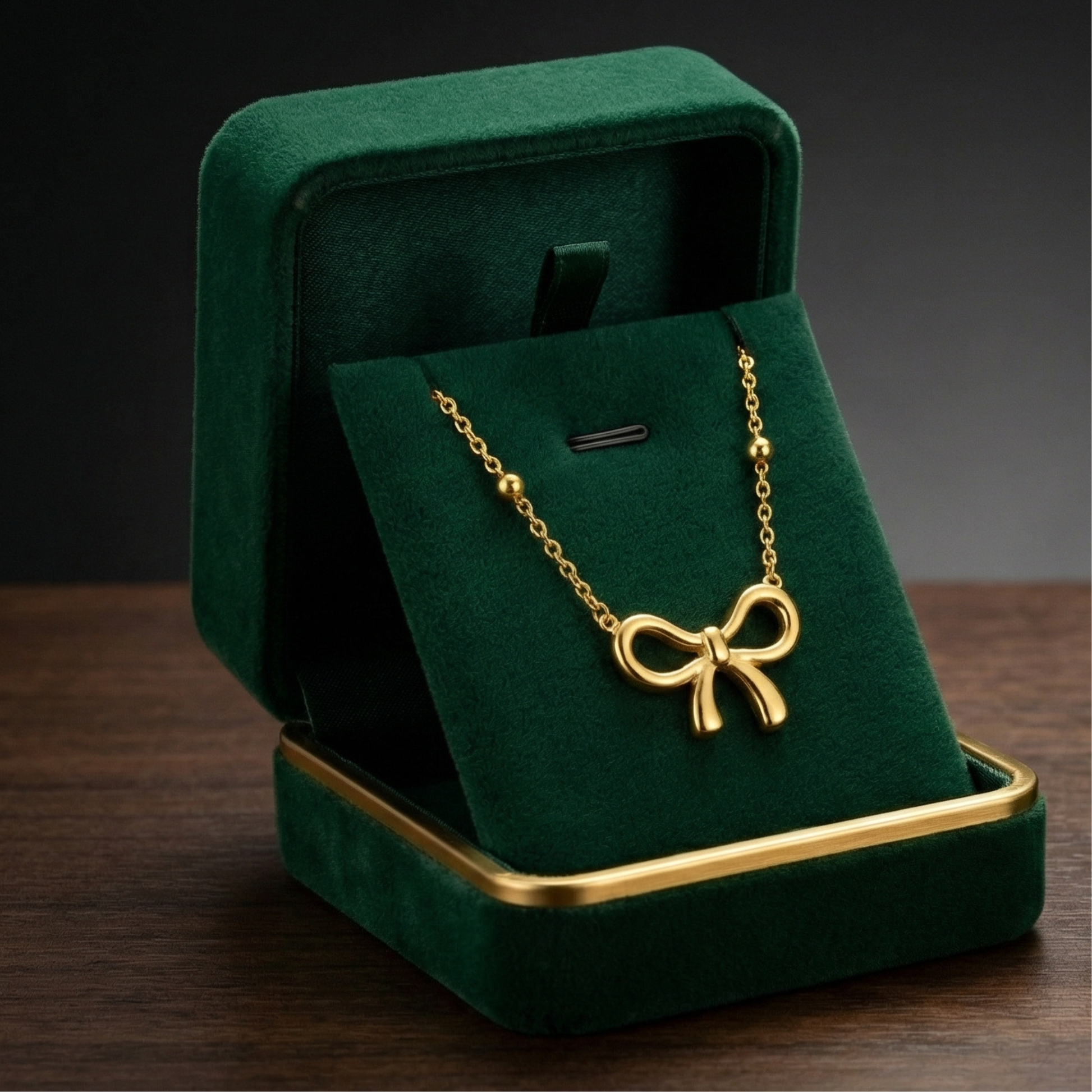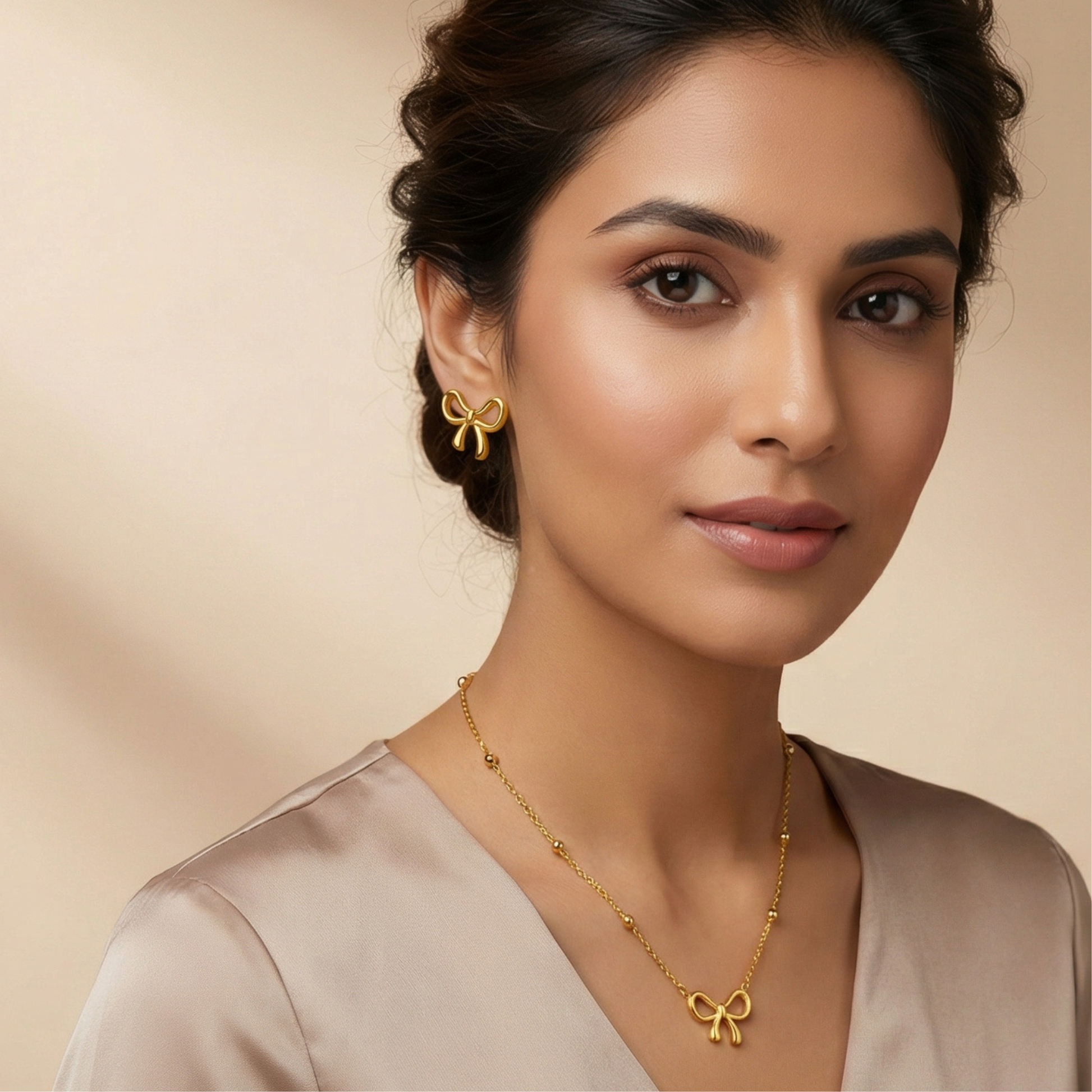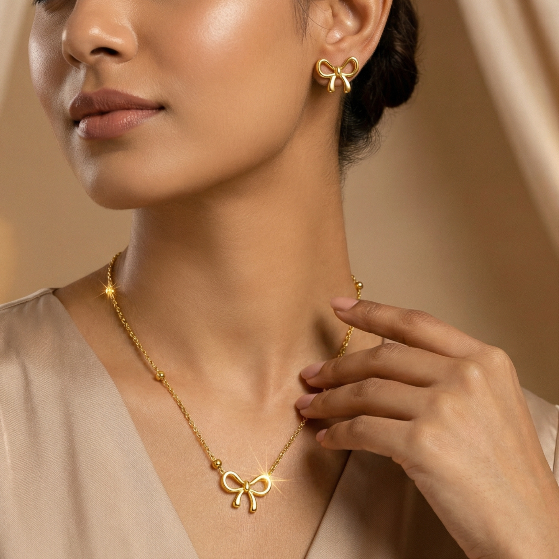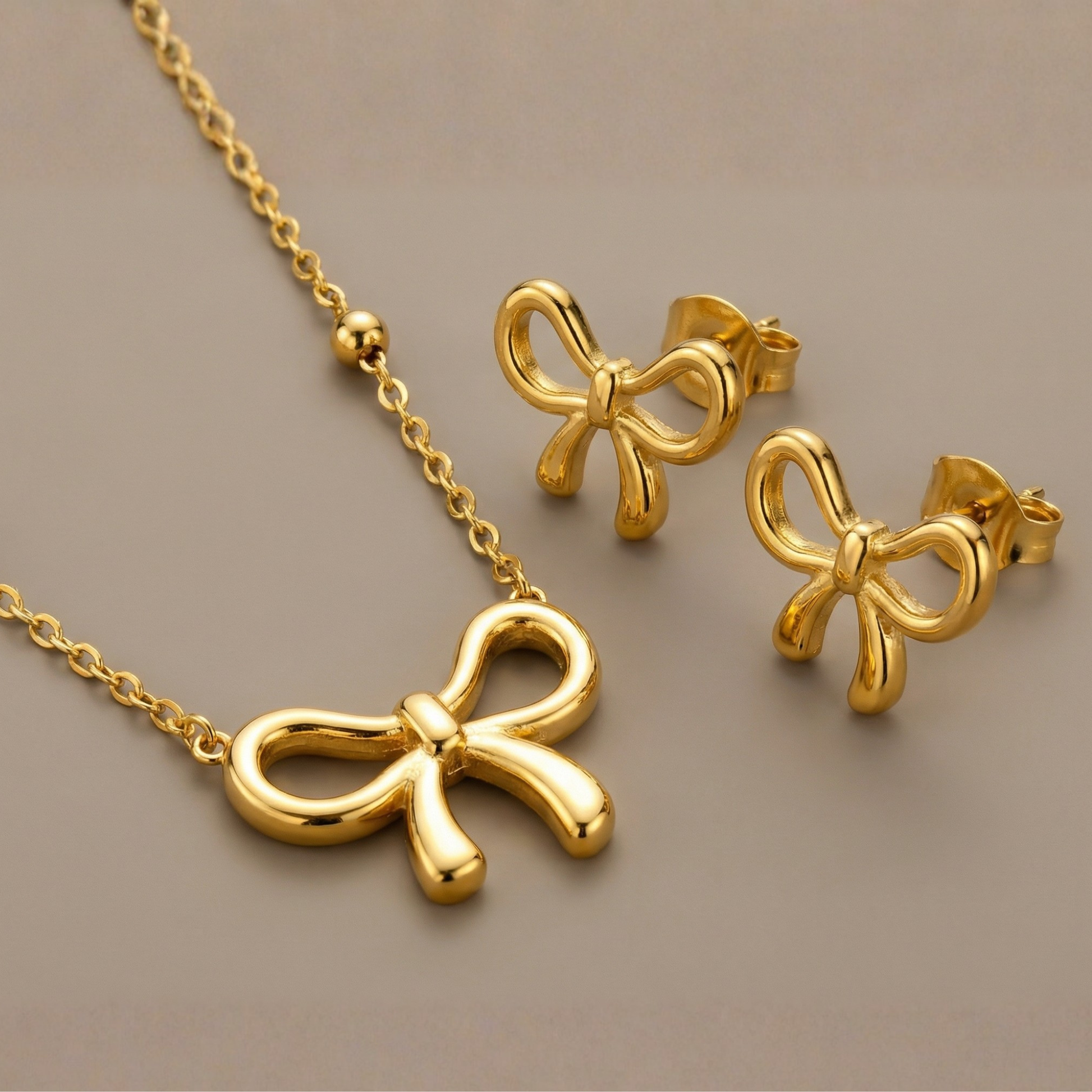 A playful yet refined jewelry set designed to add charm to your everyday style. This gold-plated bow knot necklace and matching earrings feature a smooth three-dimensional finish and a lightweight feel, making them perfect for daily wear or special occasions.