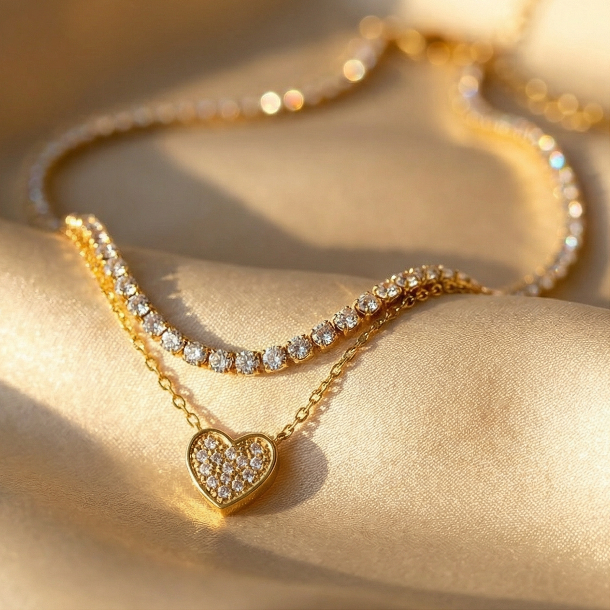 A delicate double-layer necklace designed to highlight the neckline with a soft shine. The upper rhinestone chain adds brightness while the lower fine cable chain carries a heart pendant that brings a subtle romantic touch. Crafted from durable stainless steel and finished with 18K gold plating, it keeps its color and shine through daily wear. Lightweight and comfortable, it pairs effortlessly with casual outfits, evening looks, or layered jewelry styling.